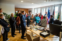 Als der Landtag um 12 Uhr seine Tore für Besucherinnen und Besucher öffnete, standen die ersten Interessierten bereits Schlange und wurden freundlich von Landtagspräsident Alexander Dierks empfangen. Danach begrüßte er sie mit einer kleinen Ansprache im Plenarsaal ganz offiziell zum Tag der offenen Tür.