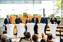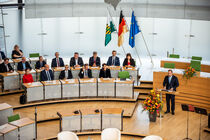 Vor über 300 Gästen im Plenarsaal hat Landtagspräsident Alexander Dierks in einer Rede an die Wiedervereinigung 1990 erinnert. Er rief dazu auf, gemeinsam die Werte Freiheit, Demokratie und Rechtsstaatlichkeit zu verteidigen. "Wir erleben nach 35 Jahren wieder einen Epochenbruch in Europa. Wir erleben, dass liberale Demokratien im Äußeren und im Inneren unter Druck geraten", so der Landtagspräsident. Anschließend warf Politikjournalist Robin Alexander in einem Impulsvortrag einen Blick auf das parlamentarische System in Sachsen und der Welt. Er mahnte an: "Wenn wir den Streit so weit treiben, dass die Institutionen schaden nehmen, dann kann auch eine ganze Menge schieflaufen." Anschließend diskutierten die beiden Redner unter der Moderation von Uta Georgi gemeinsam mit Politikwissenschaftlerin Dr. Prof. Astrid Lorenz, die u. a. dafür warb, die Demokratie als "Wettbewerb der Ideen" zu sehen. Zum Ende der Zeremonie sangen alle gemeinsam die deutsche Nationalhymne, begleitet durch das Blechbläserquartett der Schülerinnen und Schüler des Sächsischen Landesgymnasiums für Musik in Dresden.